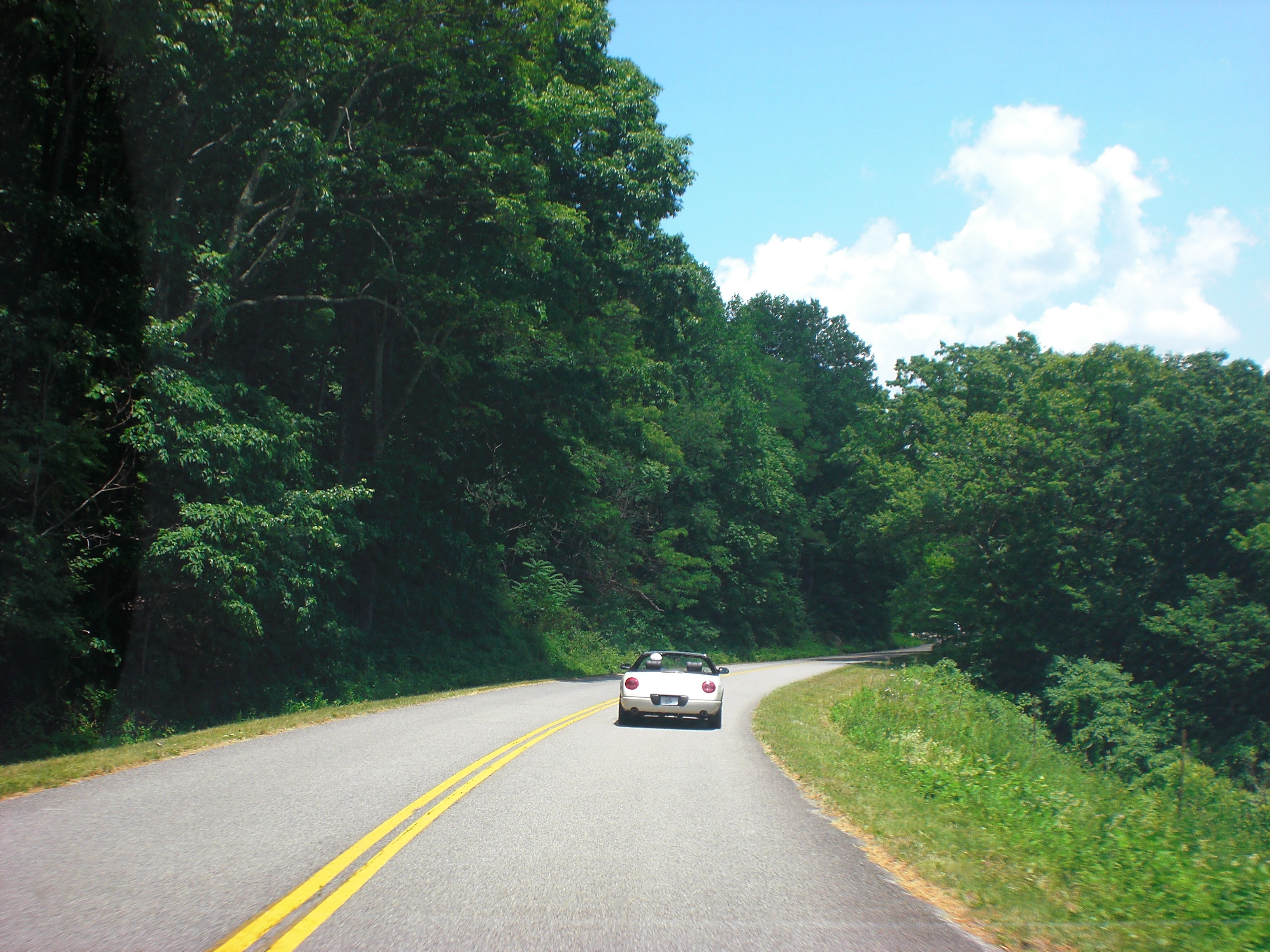 The expansive views continued and there are places where we could look down into valleys far below on either side of the ridgeline road. We could also see a Wal-Mart in a town adjacent to the parkway, which really disrupted the ambiance, but not for long. As we had the day before, we continued to stop and take pictures and look out across the bluish haze at ridgeline after ridgeline.