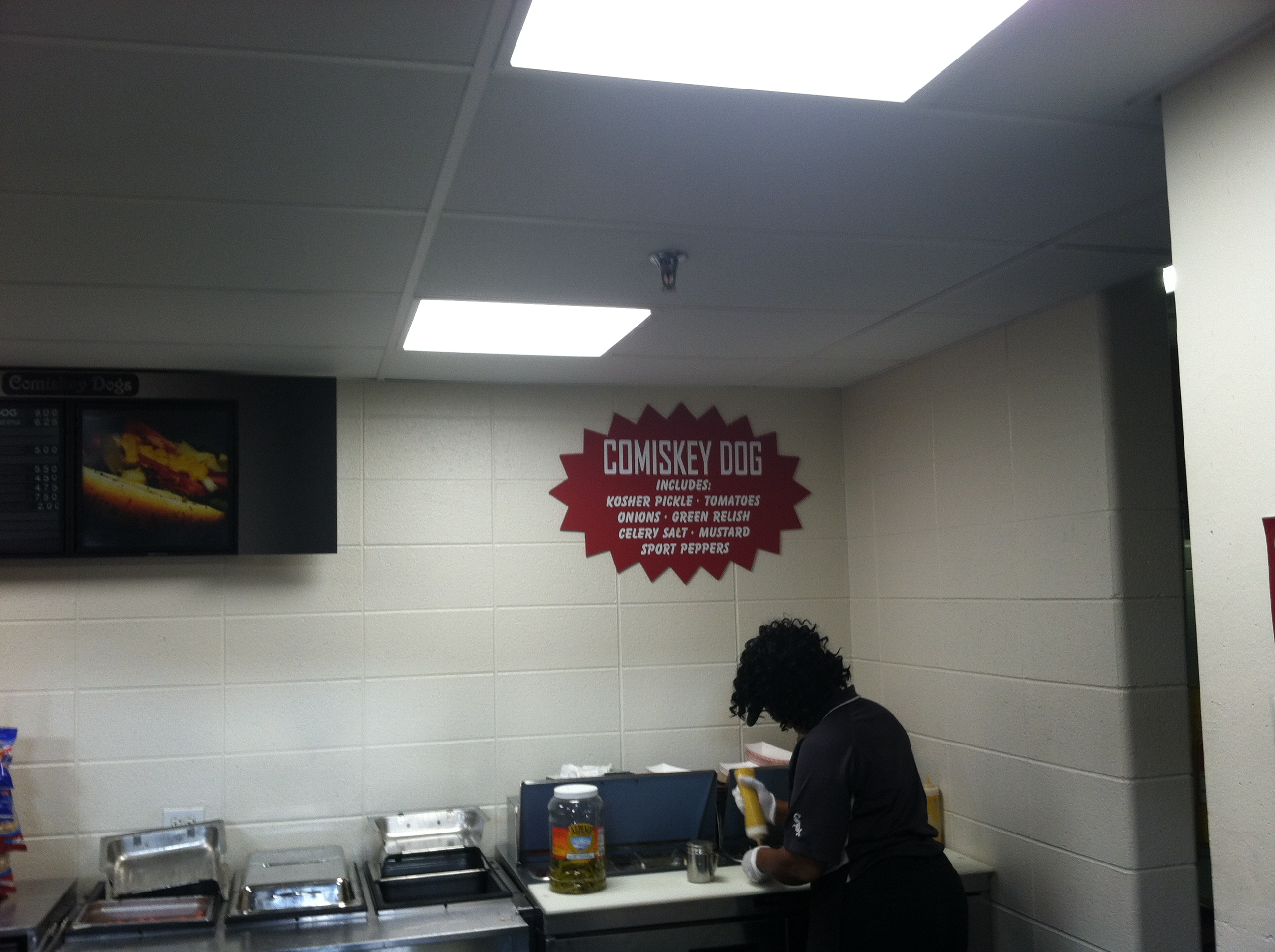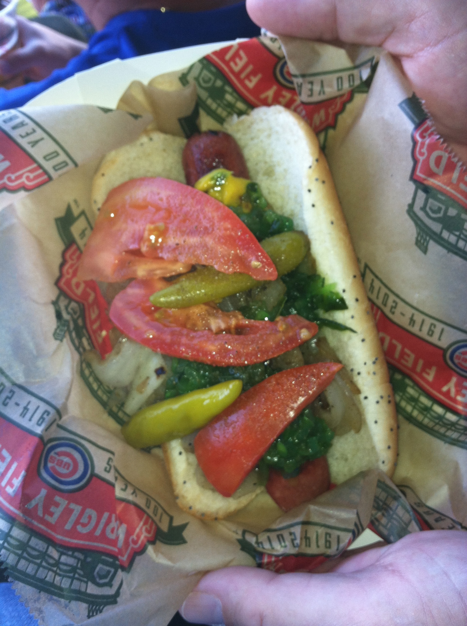 As part of the festivities inside, they developed ten “Decade Dogs,” themed according to the era. The TV Dinner Dog represented the fifties as the featured decade on the day we were there. It’s a hot dog topped with mashed potatoes, gravy and corn, and while intriguing in its originality, it didn’t seem specifically representative of Chicago, so instead I opted for the Chicago Dog. I added my own toppings to the dog on a poppy seed bun and the garnishes are what truly make it Chicago-style. I layered mustard, neon green relish (green color added, according to a ballpark staff member, as a nod to Chicago’s Irish), onions, tomato wedges, small peppers and the essential celery salt. The tomatoes, peppers and celery salt all add a savory, fresh taste to the nice juicy dog. It was a great start to the week of ballpark dogs.