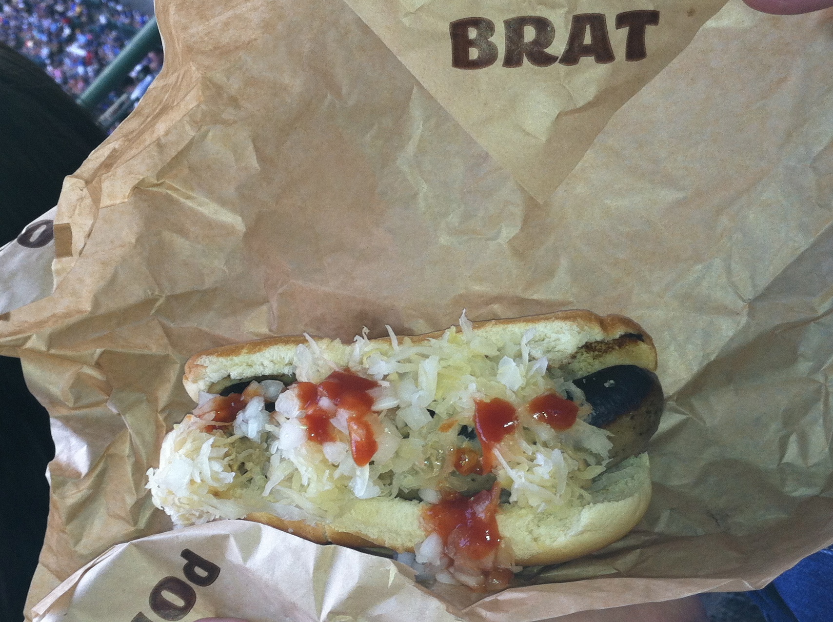 Sure enough, we met a family who welcomed us to their pre-game ritual like we were long-lost friends. They grilled our brats for us, traded beers and even offered us their buns, ketchup and chopped onions. That experience would be nearly impossible to surpass for both the tastiness of the market brats and the shining example of goodwill towards out-of-towners, but staying true to my mission, I also sampled a brat inside the ballpark.