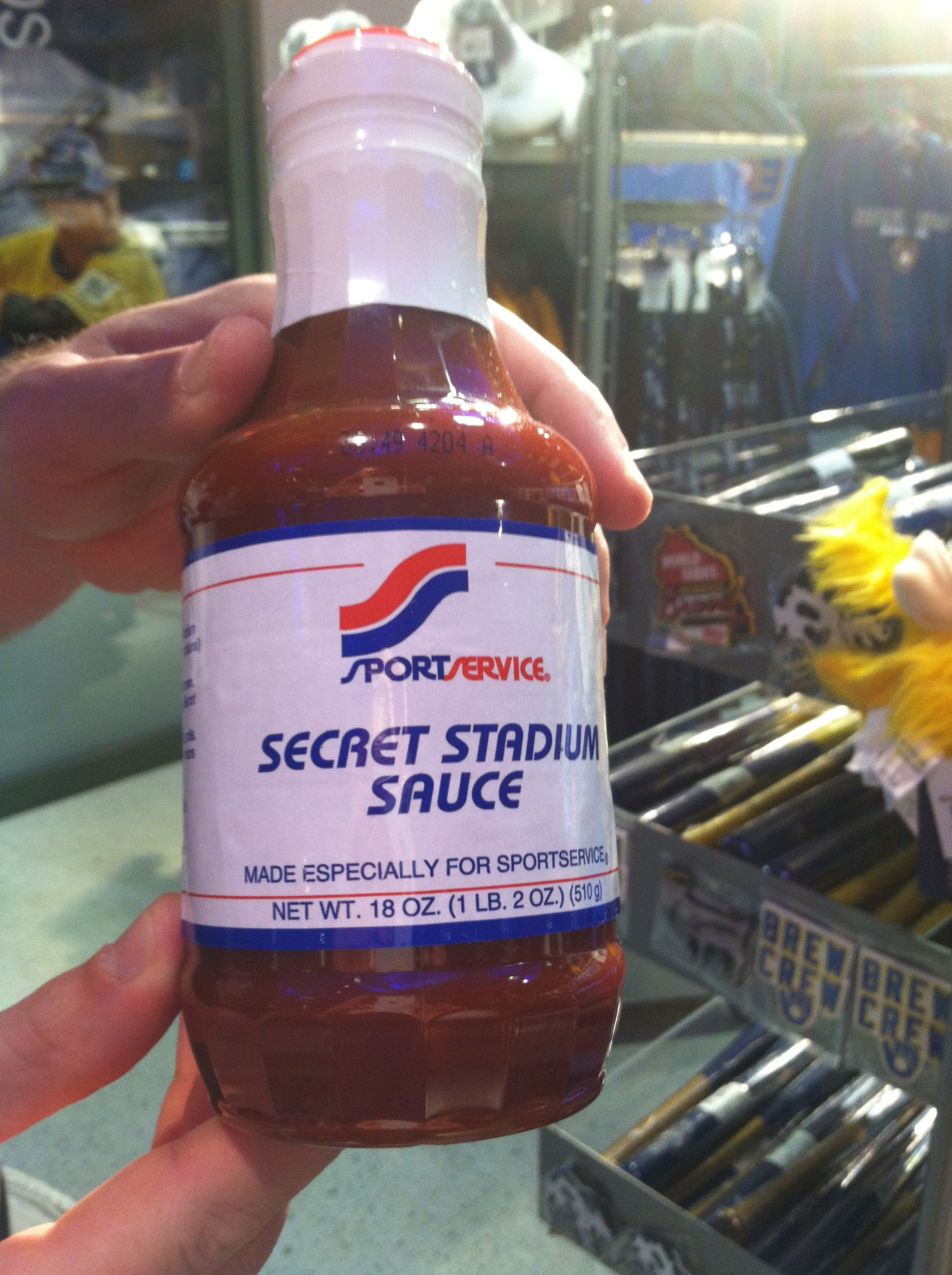 It came grilled and cradled in a plain bun. I added my own condiments – mustard, onions, sauerkraut, and because it was on the condiment stand and I hadn’t seen it before, Stadium Sauce from the bottle, which tasted like amped-up ketchup. You can buy bottles of the sauce in the souvenir shops. It was a good, basic brat. But the lovely family we met outside trumped any brat stand inside.