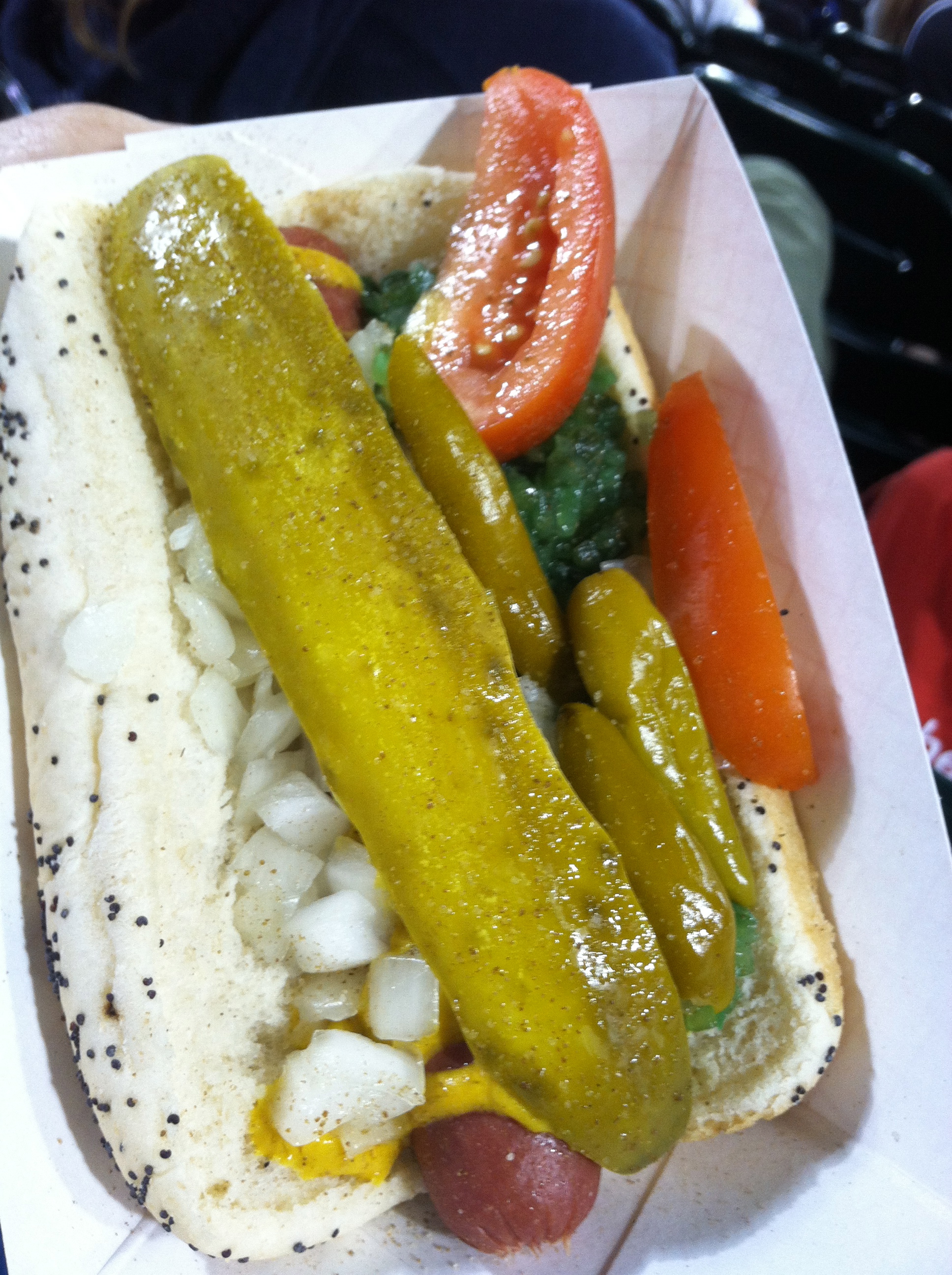 Post parade, canines and owners found their seats for the game, and I found the Comisky (name of the original White Sox venue) Dog, which was almost identical to the Chicago Dog at Wrigley – poppy seed bun, mustard, relish, tomatoes, and peppers – with two notable differences. Here they put the condiments on the hot dog for you, neon green relish and all. I liked that. And they also added a dill pickle spear, which for me gave the Comisky Dog the edge over the Chicago Dog at Wrigley. Either way, Chicago definitely knows how to do a great hot dog.