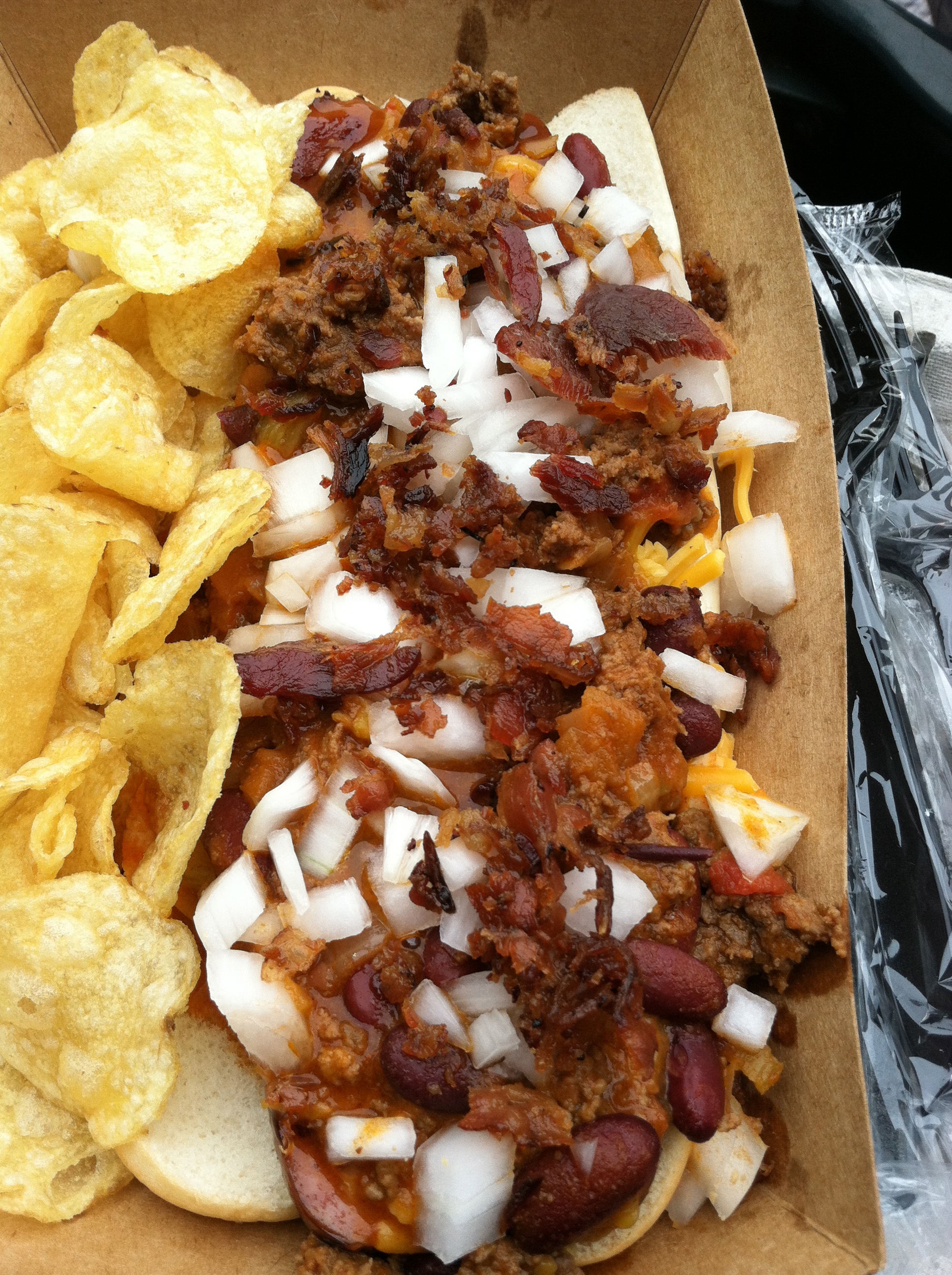 Weather conditions were cold and gray for this day game, so something with chili on it sounded good. Here, too, I chose elaborate over simple.