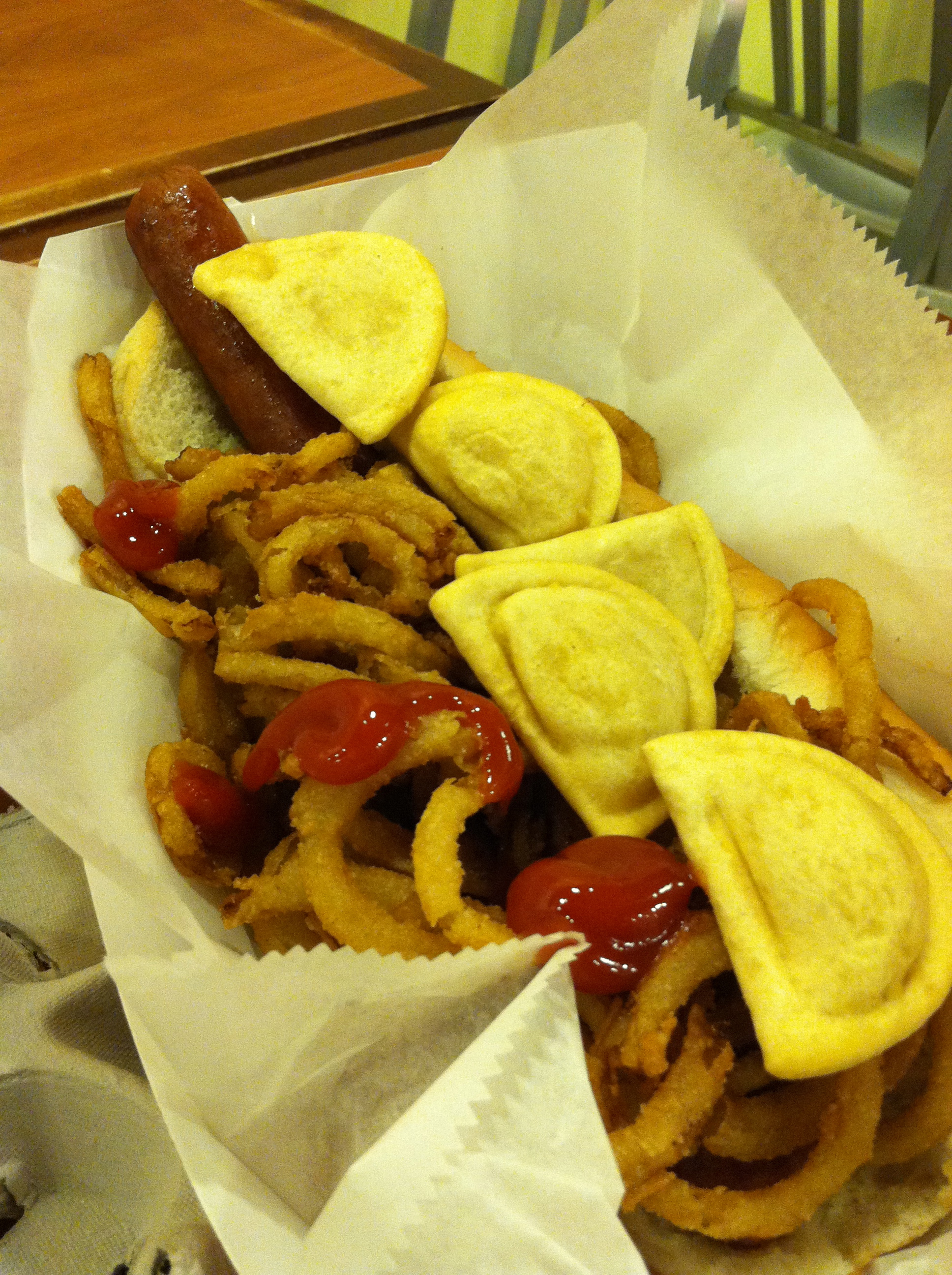 And it’s a good thing to walk after eating a dog like this. Called the Polish Hill Dog, it started with a layer of cole slaw on the bun under the foot-long hot dog, then topped with thin onion rings and small potato pierogi. I added ketchup only. I have to admit, this one was imaginative, but just a little over the top.