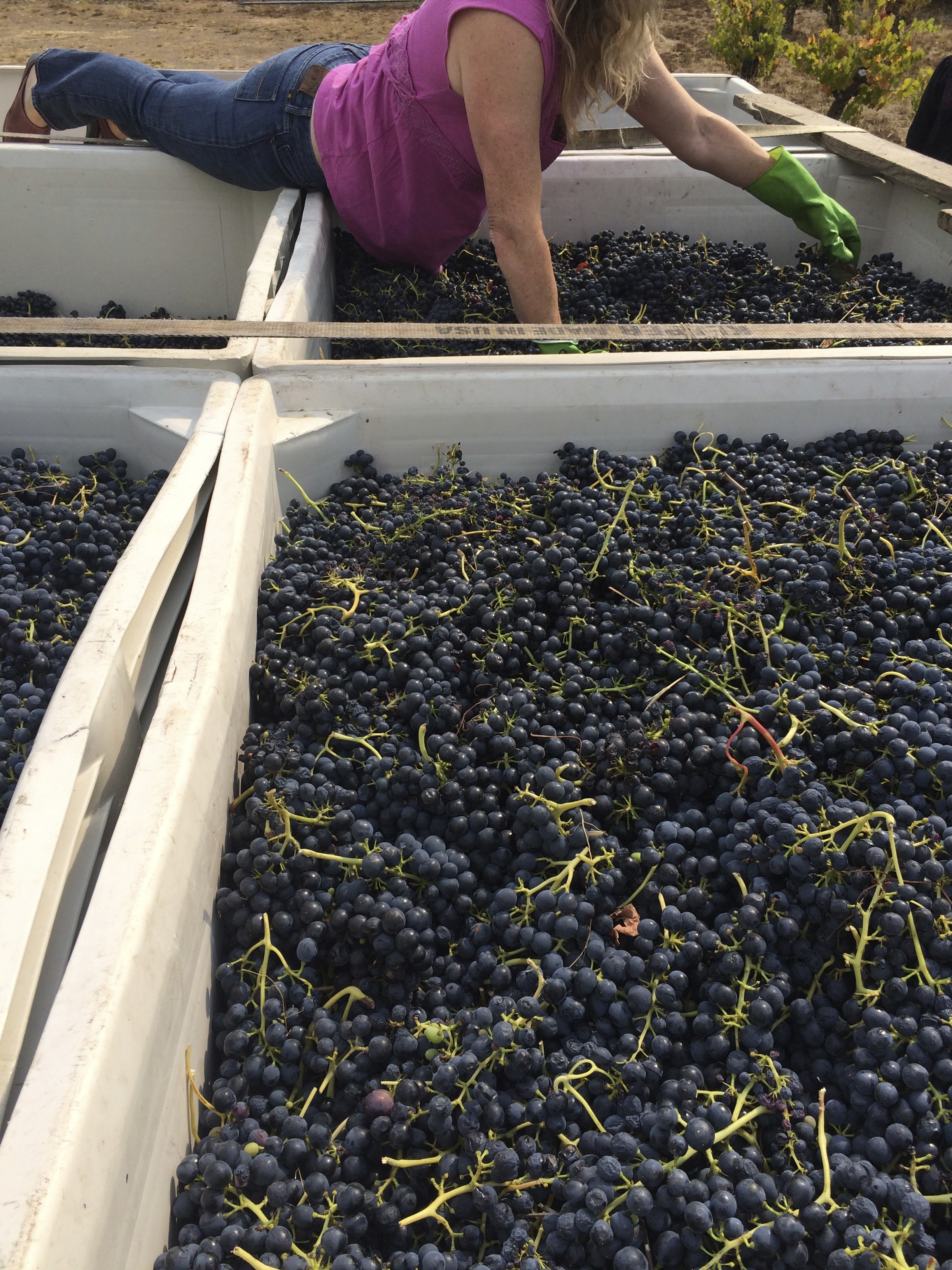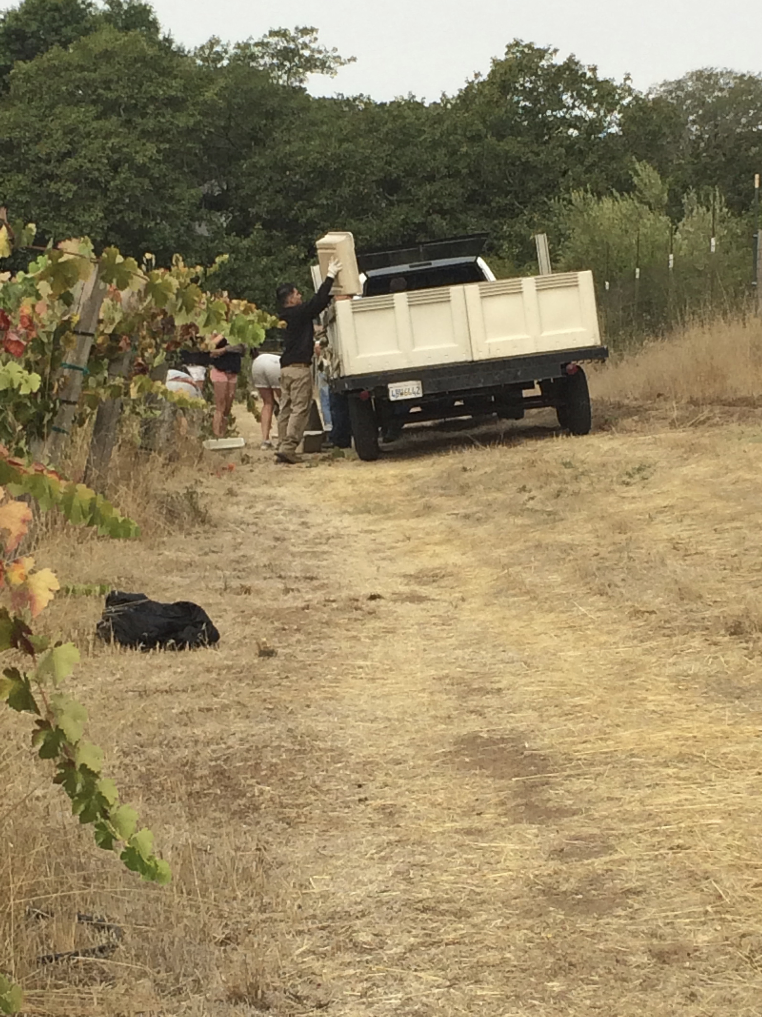 Having never harvested grapes, my husband and I were intrigued by the opportunity. So the following Sunday at 6:30 a.m. we arrived at the winery in the early morning darkness. Darek greeted us, and as dawn increasingly lightened the sky, he pointed to a pink bakery box of donuts to fortify ourselves for the morning ahead and made introductions as everyone gathered.