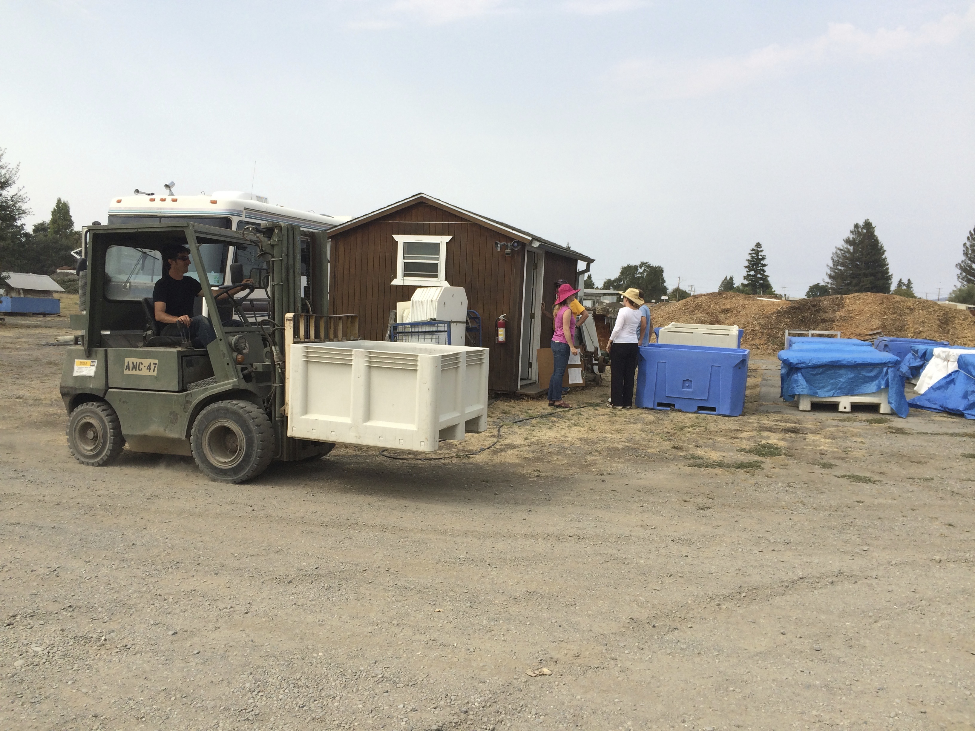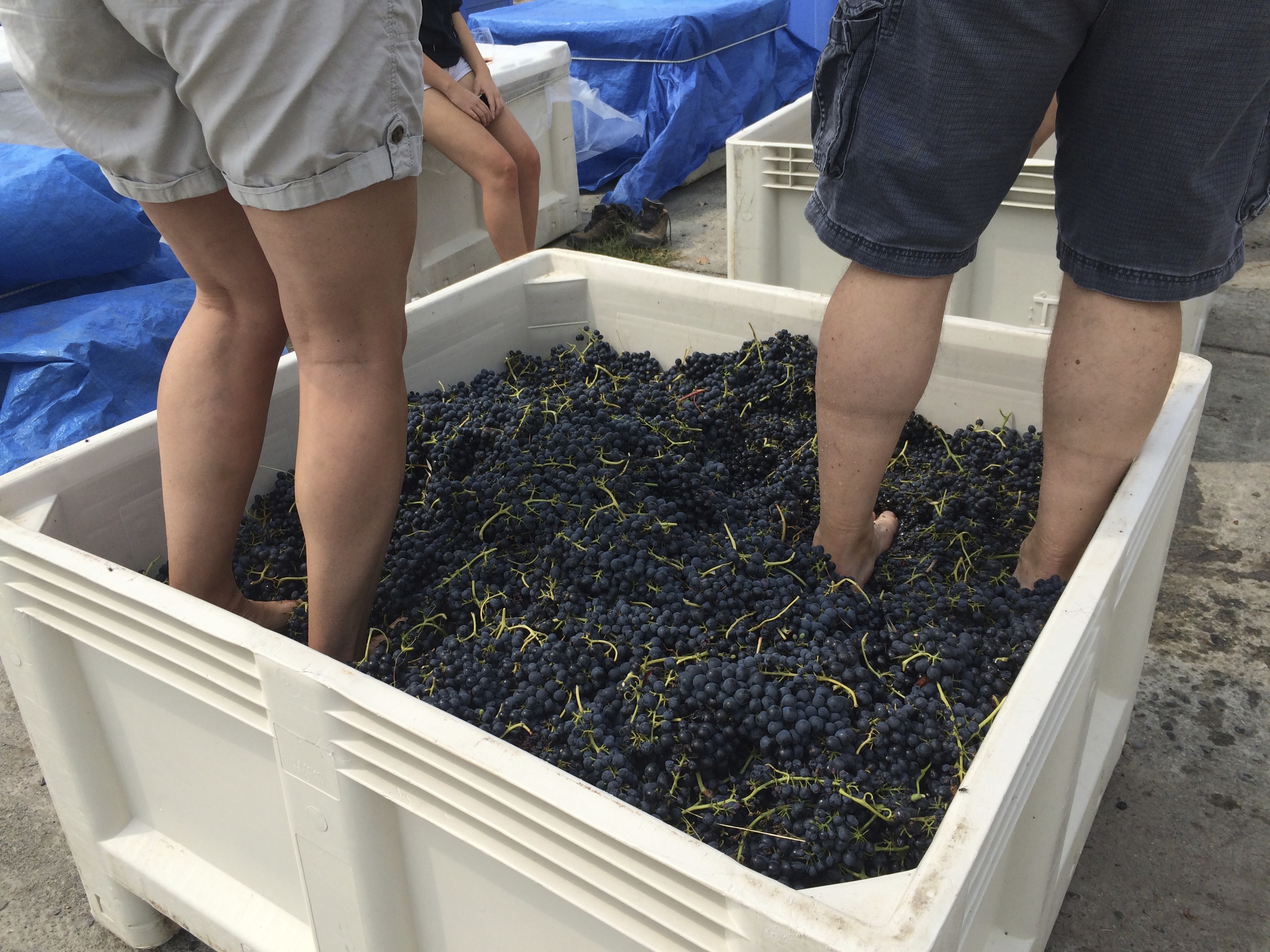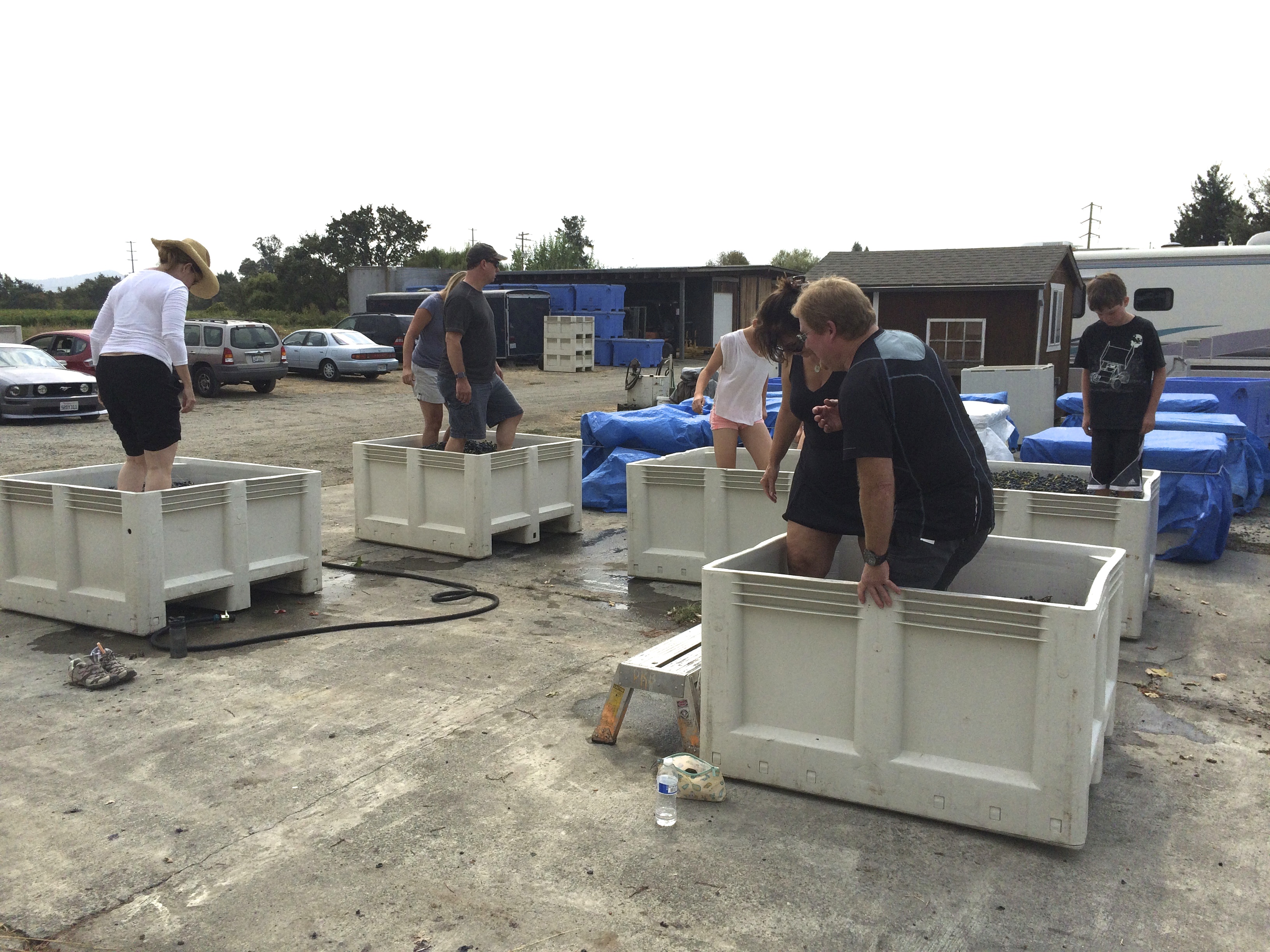 Back at the winery, a forklift-driving Darek offloaded and weighed the bins full of just-harvested grapes, and the stomping began for those who wanted to participate. I preferred to watch and listen. It took quite a while for the stompers to complete the job, admitting it was a great workout and talking about how they could feel the stems and seeds as they stepped vigorously, causing a sloshing, slurping sound. Talking and laughing, people rotated in and out and worked at it for well over an hour.