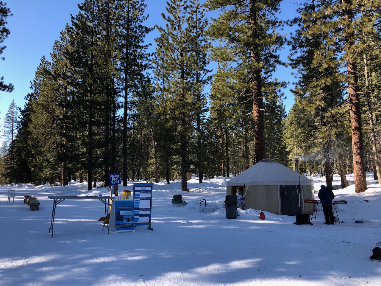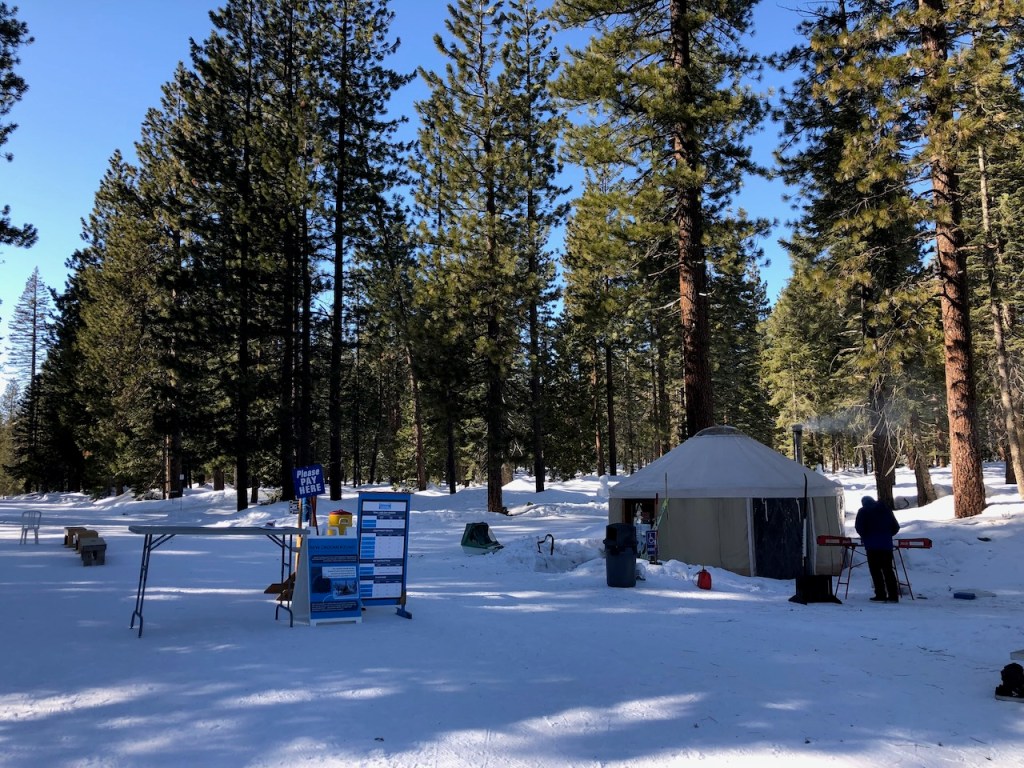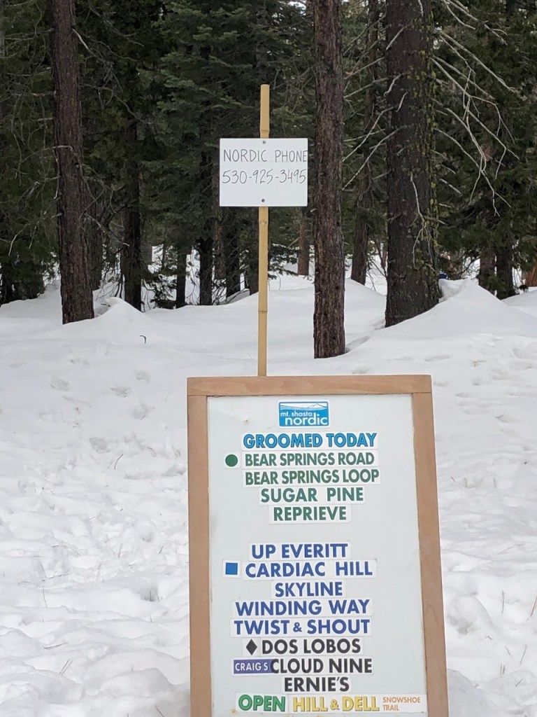 We planned our snowshoe outing for a Thursday, but we arrived the afternoon before and had time to survey the setting under clear skies and bright sunshine. Adjacent to the Nordic Center parking lot, we noticed the rental equipment trailer, a few benches, and the staff yurt with smoke drifting out its chimney. While there wasn’t currently a lodge for visitor use, there may be one in the future according to the web site. The Nordic Center is a program of the Siskiyou Outdoor Recreation Alliance, which has applied for grant funding to construct a new trailhead lodge facility.